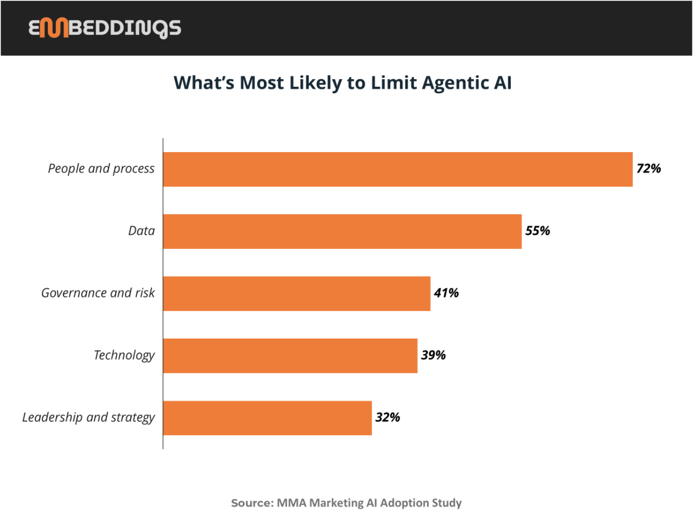 Asked what is most likely to limit their ability to scale, marketers ranked people and process first (72%), followed by data (55%), governance and risk (41%), technology (39%), and leadership/strategy (32%).