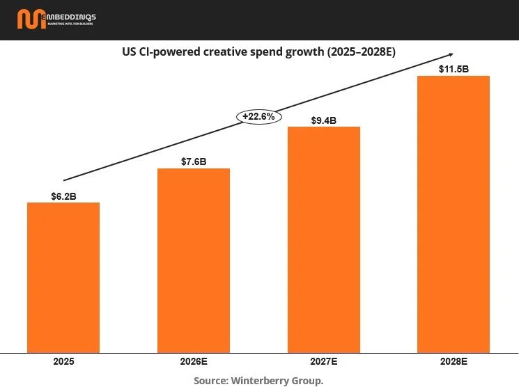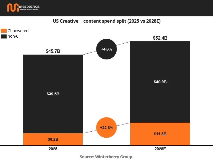 The second chart shows total US creative and content spend growing modestly from about $45.7B in 2025 to $52.4B in 2028. Within that relatively stable pool, CI powered spend nearly doubles, while non CI spend grows only marginally.